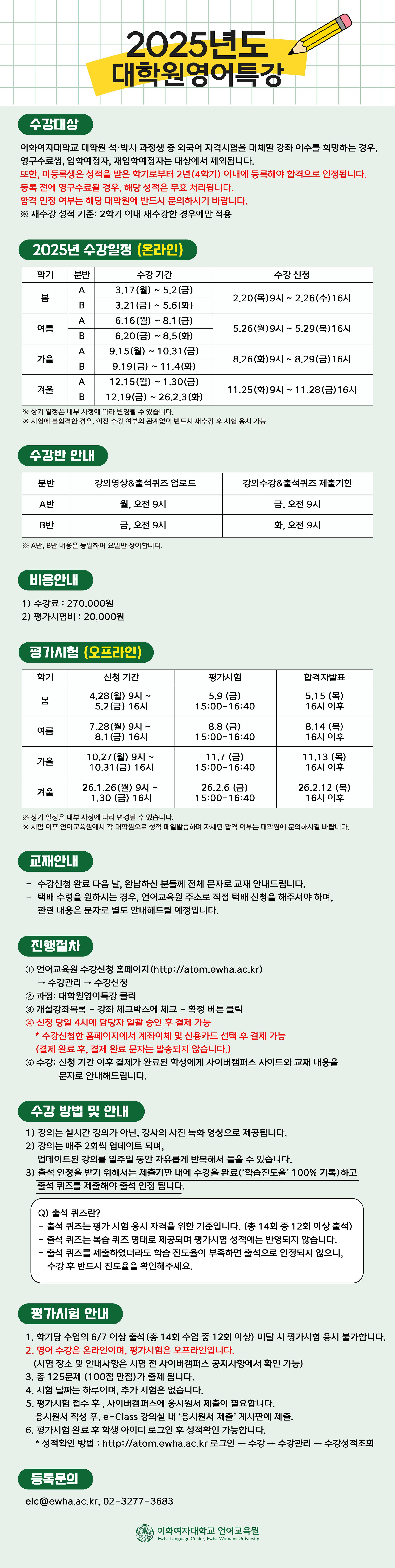 ※2025 겨울학기 대학원영어특강은 비대면 온라인 수업으로 진행되나, 평가시험은 오프라인으로 진행됩니다.