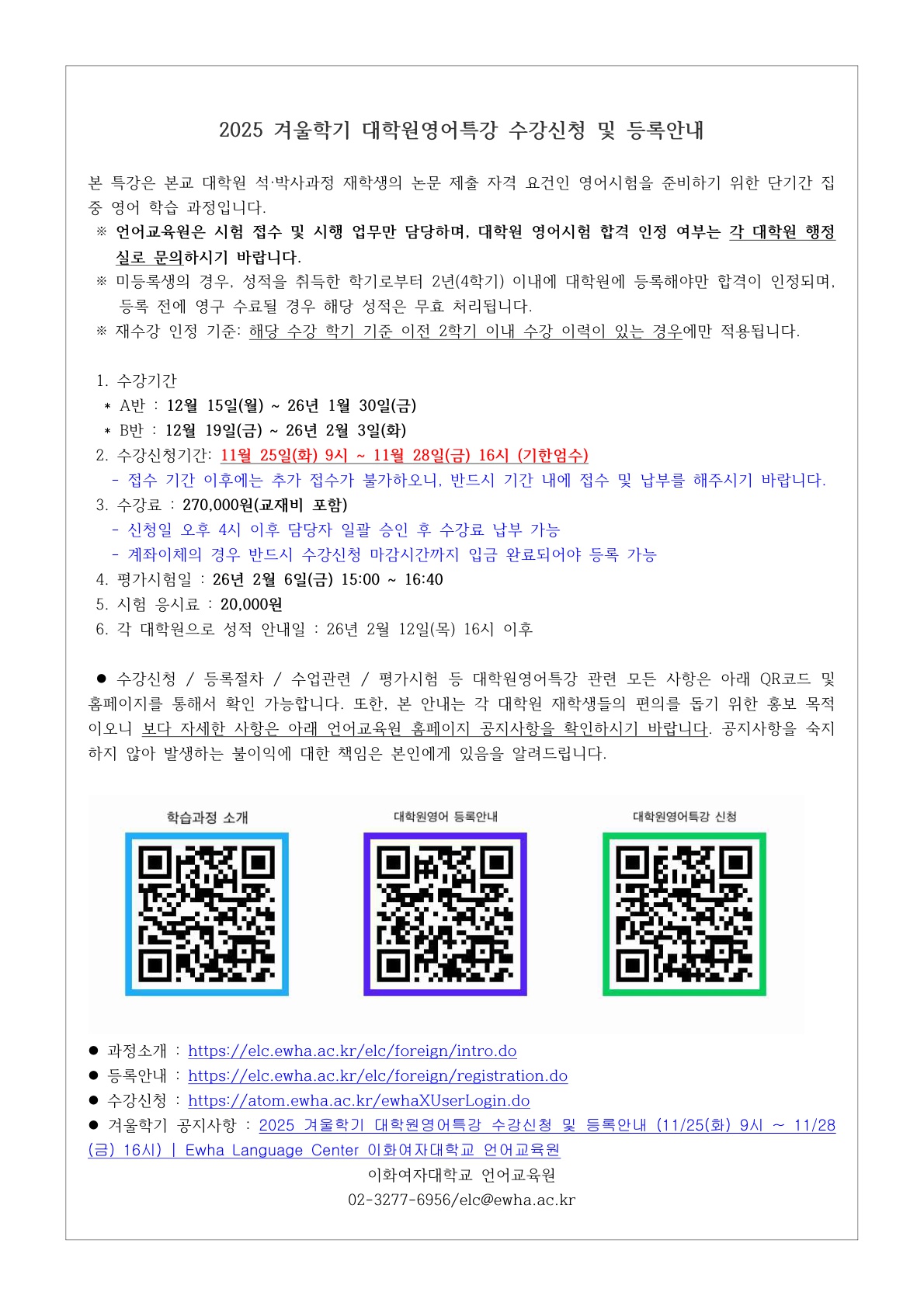 이화여자대학교 언어교육원에서는 2025학년도 겨울학기 대학원영어특강을 12월 중 개강합니다.