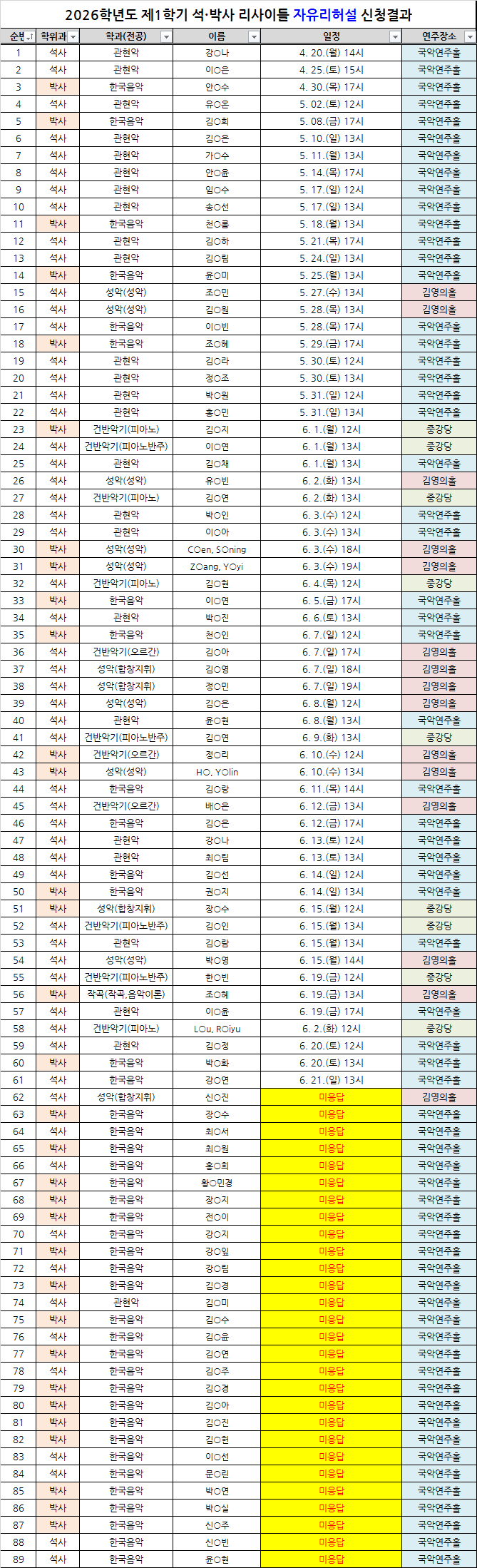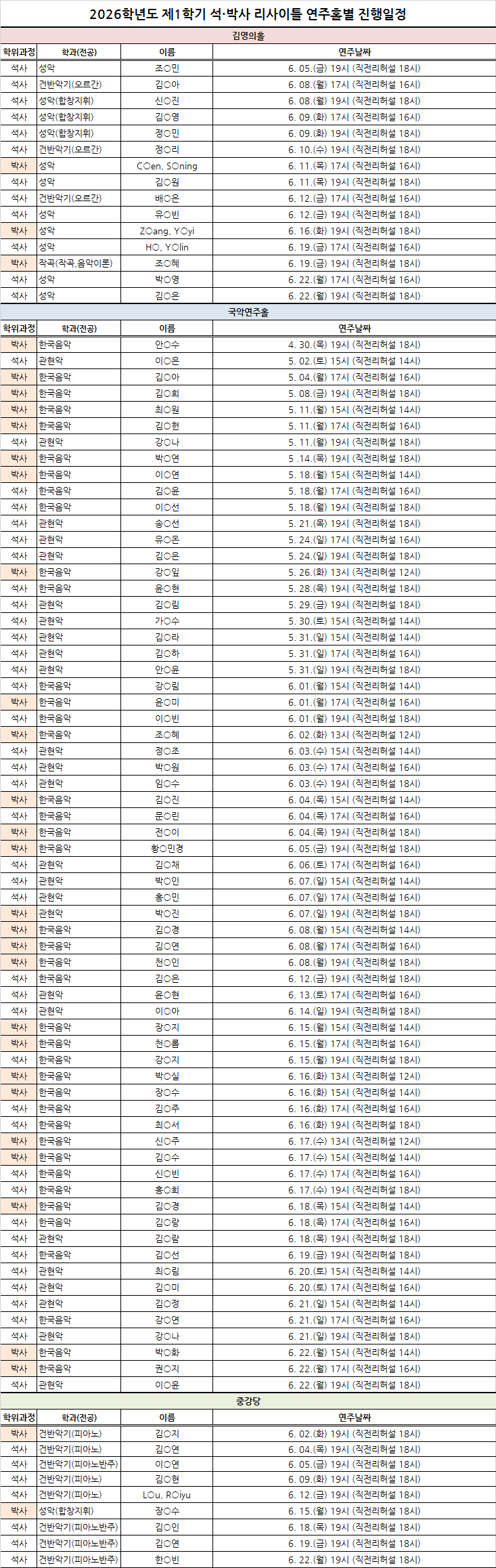 2026학년도 제1학기 음악학부 석·박사 리사이틀 관련 추가 안내 드립니다.