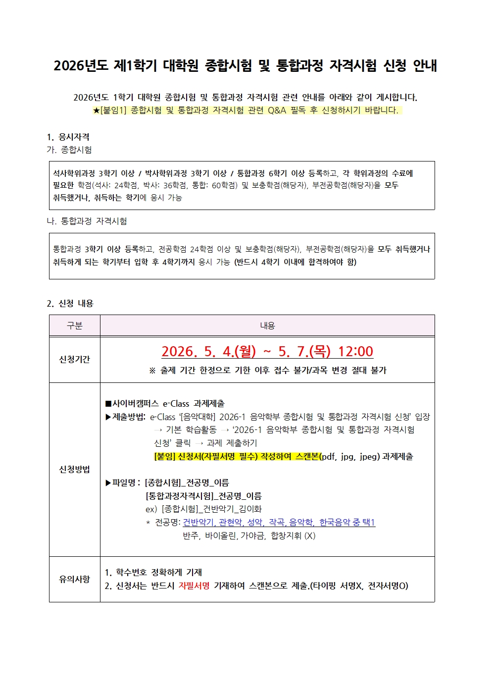 [학사] 2026-1 대학원 종합시험 및 통합과정 자격시험 신청안내(~5.7. 12시)